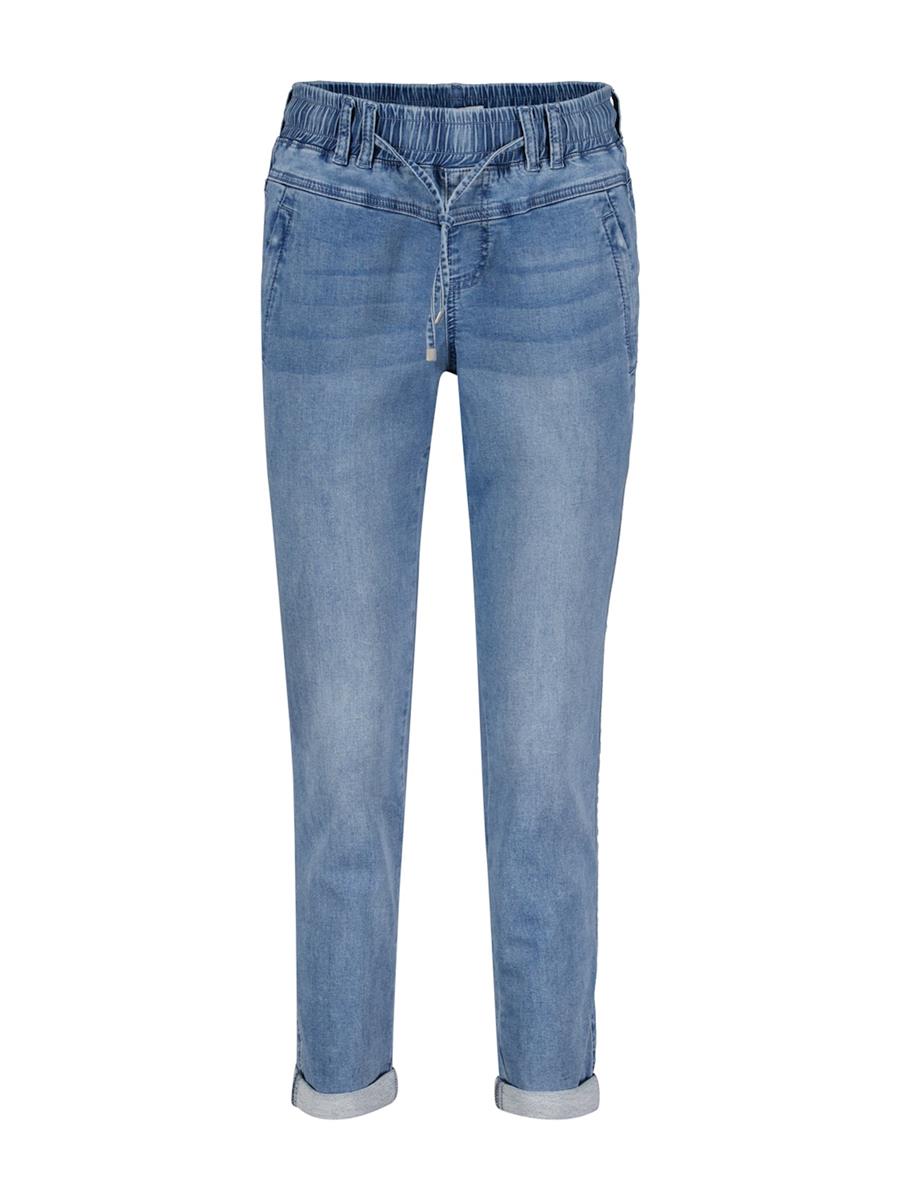 Smart buks i midstone denim fra Red Button. Buksen har bred elastik kant i linning med snører, to skrålommer foran med lynlås, og to baglommer. Buksen har masser af stræk samt valgfrie op-smøg ved anklen.Kvalitet: 82% Bomuld - 11% Polyester - 5% Viskose - 2% Elastan
