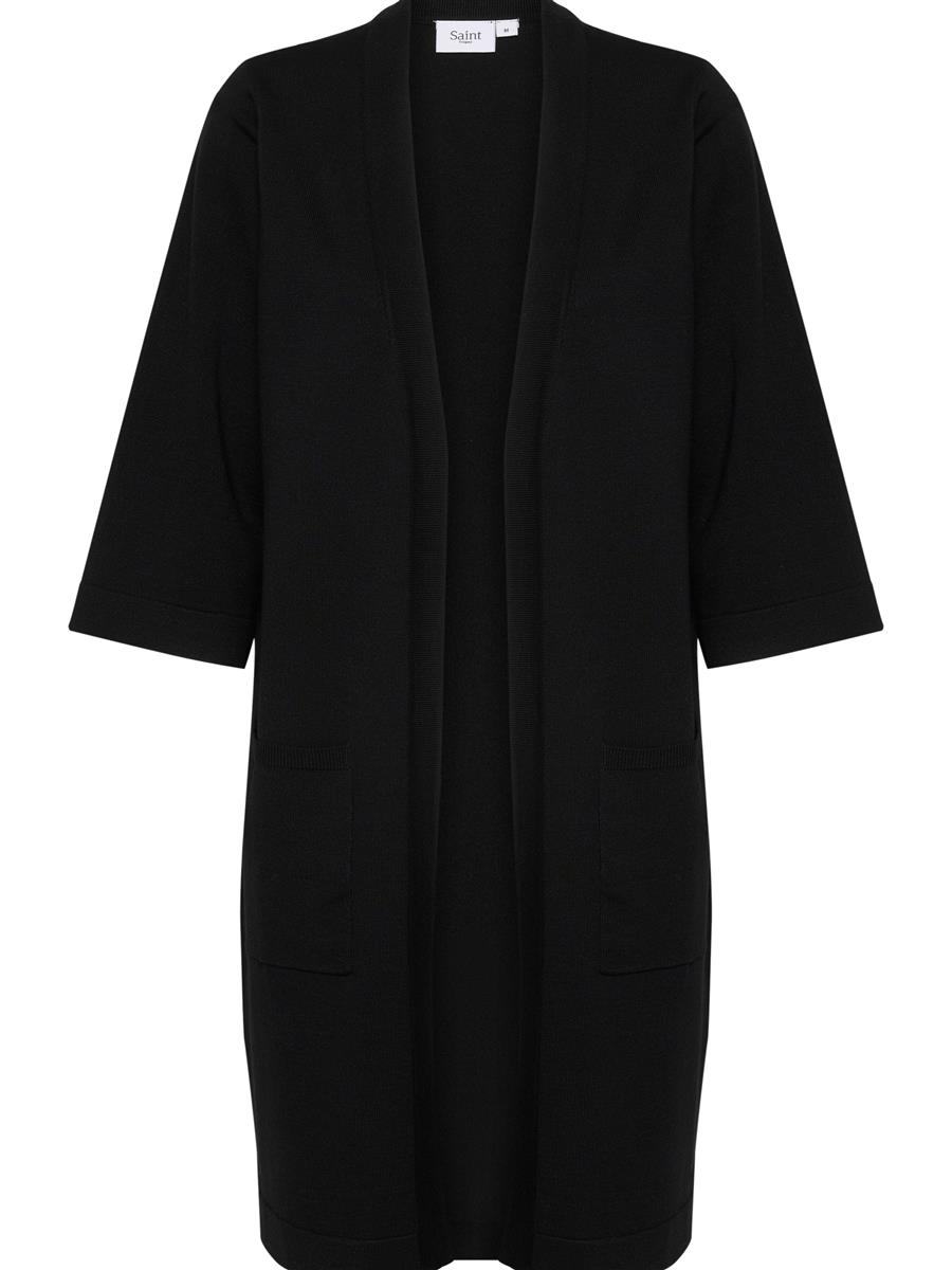 Lang åbenstående strik med 3/4 ærme og lommer foran.
