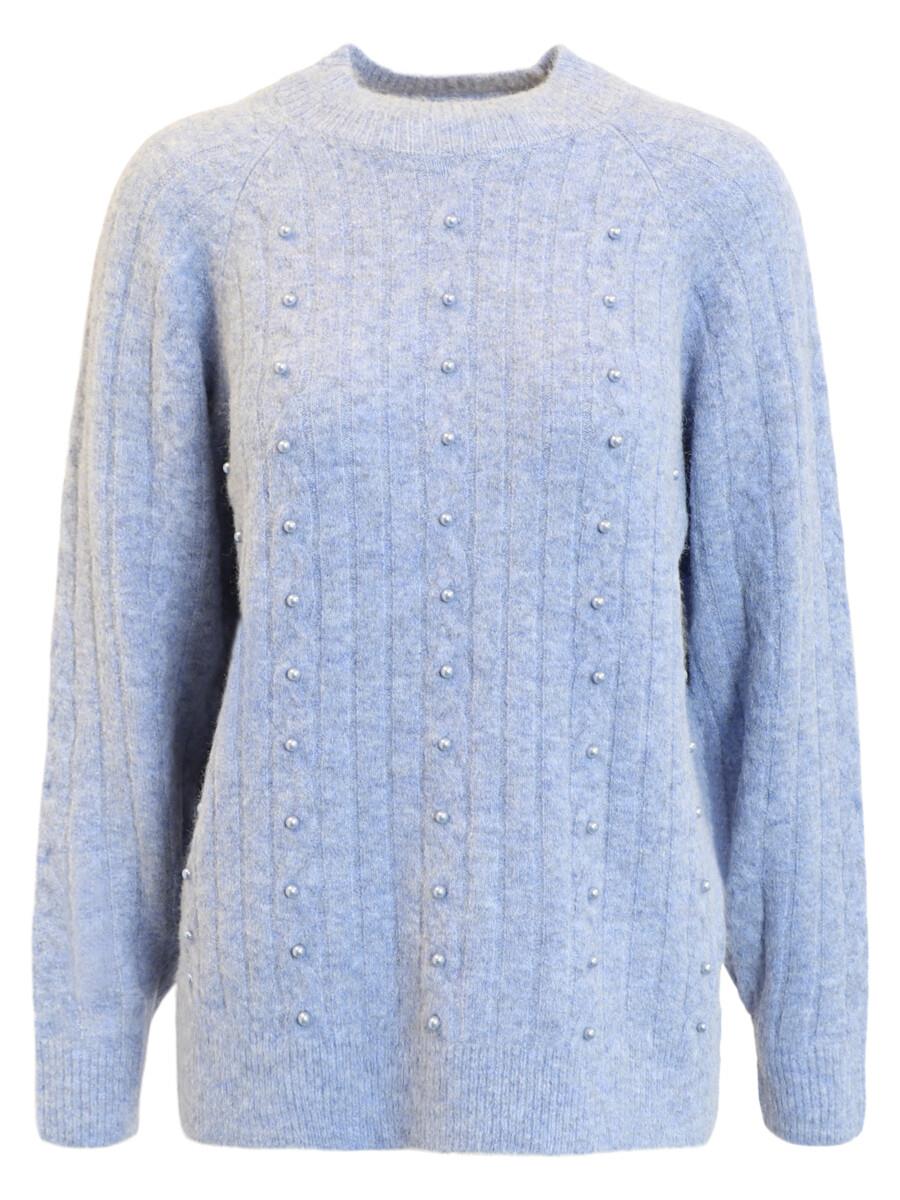 Flot strikmønster med påsyet lyseblå perler.