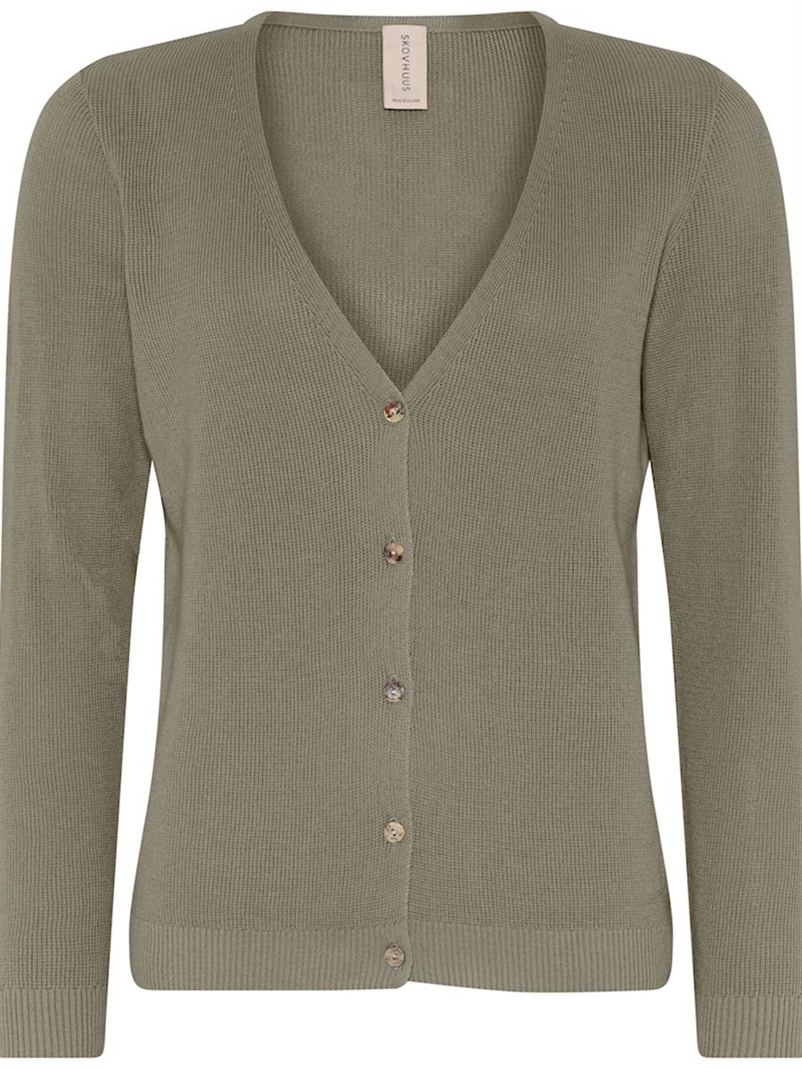 En flot og enkel cardigan med en dyb v-halsudskæring. Strikket i fint ensfarvet rib med brede ribkanter i ærmer og kant. Cardiganen lukkes med små naturfarvet knapper. Normal i størrelsen og anvendelig til både hverdag og fest.