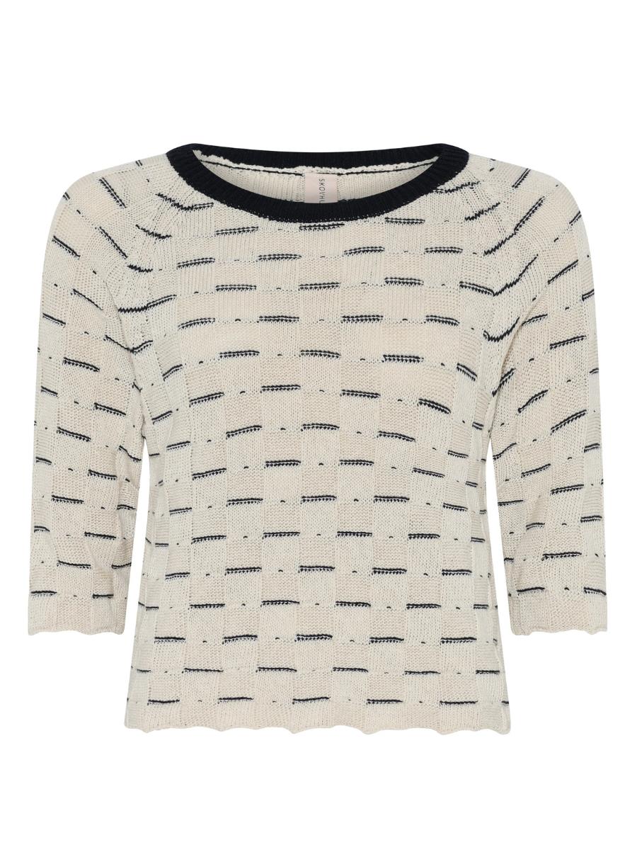Denne smukke Skovhuus strik er med en klassisk rund halsudskæring, og med 3/4 ærmer, som er to lækre og klassiske detaljer, derudover har den en smart rib kant omkring halsudskæringen, samt en lækker bølget kant i bunden af ærmerne og i bunden af selve strikken.