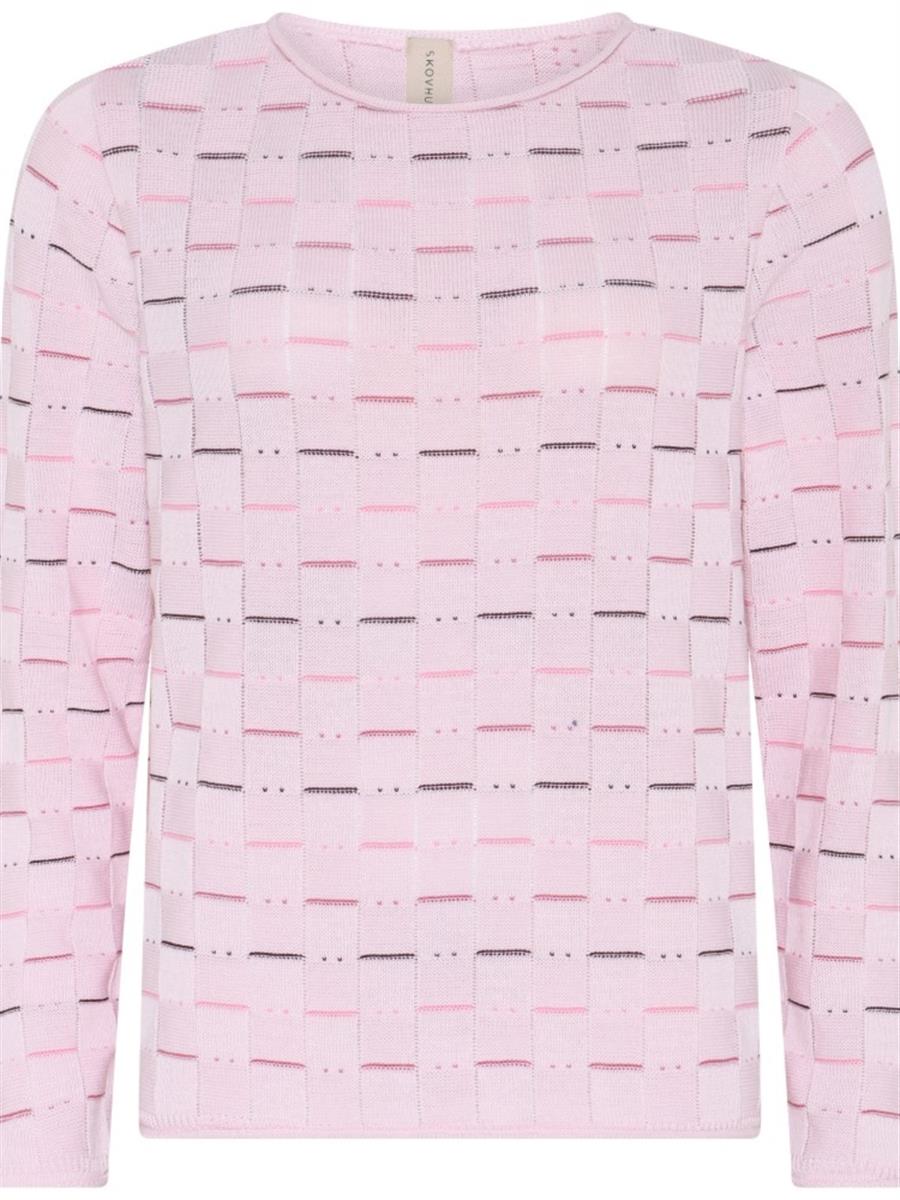 Skovhuus strik i et flot firkantet mønster i smuk lyseblå farve.Trøjen er med rund hals, lange ærmer samt i perfekt pasform. Strikken er lavet i en dejlig blød kvalitet i en bomuldsblanding, som er særdeles behagelig at have på.