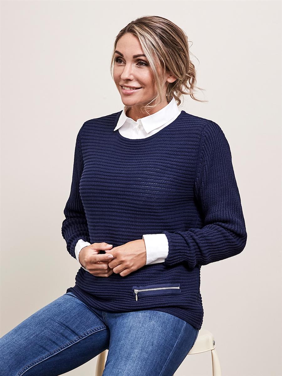 Inspireret af det skandinaviske, klassiske design er denne strik perfekt i alle garderober. En let anvendelig bluse, som kan bruges med både bukser, nederdel eller over en kjole. Skovhuus model 5353 har en rund hals og er strikket i rib, som løber i forskellige retninger. Ved ærmerne vender ribben således, at den løber lodret langs armene og på kroppen er dette ”lagt ned” så striberne fra ribben løber vandret. Dette giver et flot spil i strikkens struktur og giver en god pasform. Foran sidder en påsat lynlås som en lækker detalje.