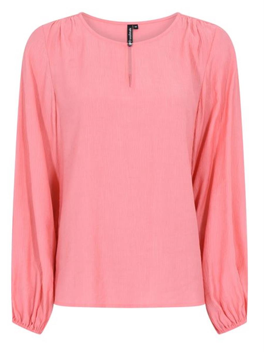 Blusen er med lange ærmer, med elastikkant forneden. Lukkes foran med en lille fin knap. Blusen er en smule længere bagtil. Kvalitet: 100% viskose