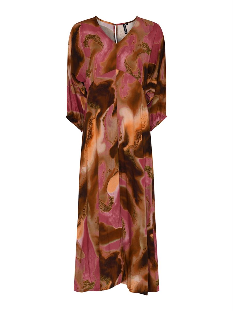 Smuk mønstret kjole fra Soulmate i varme rosa, okker, brunlige nuancer - smukt farvespil. Kjolen har en syning under brystet og hele vejen rundt om taljen, hvilket giver et flot fald. Vige 3/4 ærmer med et let elastik. Knappes i nakken.