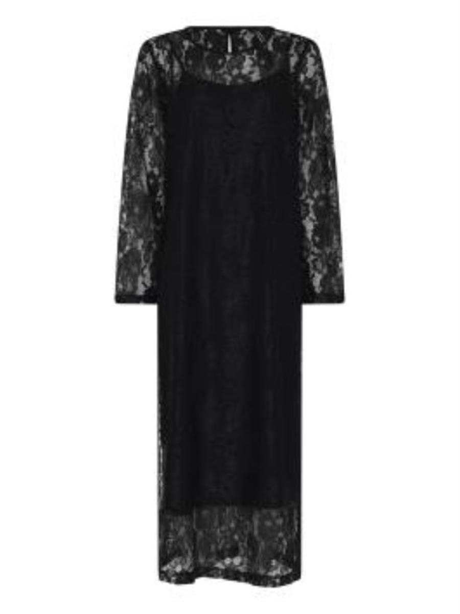 Smuk og elegant selskabskjole fra Soulmate med blonder. Der er underkjole med i viscose. Knappes i nakken. Lang flot slids i siderne