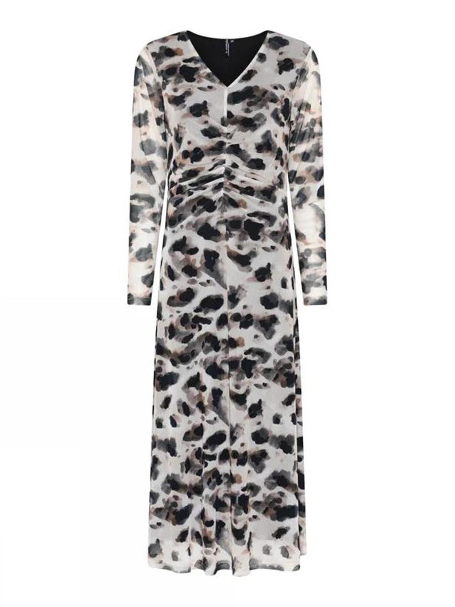 Lang og elegant chiffon kjole med leo print. Kjolen er foret så den ikke er gennemsigtig og med en flatterende rynke detalje foran ved brystet som har en camuflerende effekt. Derudover er kjolen med lange let gennemsigtige ærmer, feminin V-udskæring og i en meget flexibel stretch kvalitet.