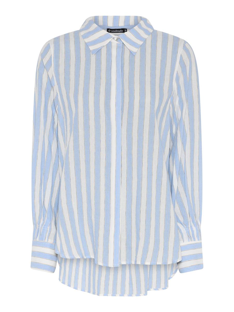 Skøn og let skjorte fra Soulmate i lyseblå og hvide lodrette striber. Skjorten har skjulte knapper hele vejen ned og går lidt længere ned bagpå med slids i siden. Den falder let og flot på kroppen - en smart og behagelig skjorte.