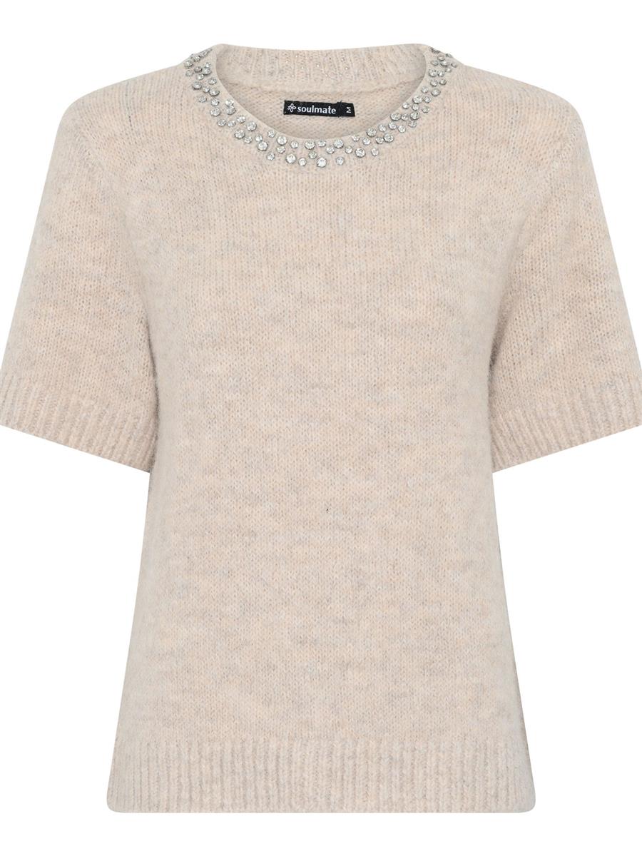 Virkelig fin kortærmet strik fra Soulmate. Strikken har rund hals med flotte simili sten i udskæringen. Kan bruges som den er, eller med en skjorte indenunder.