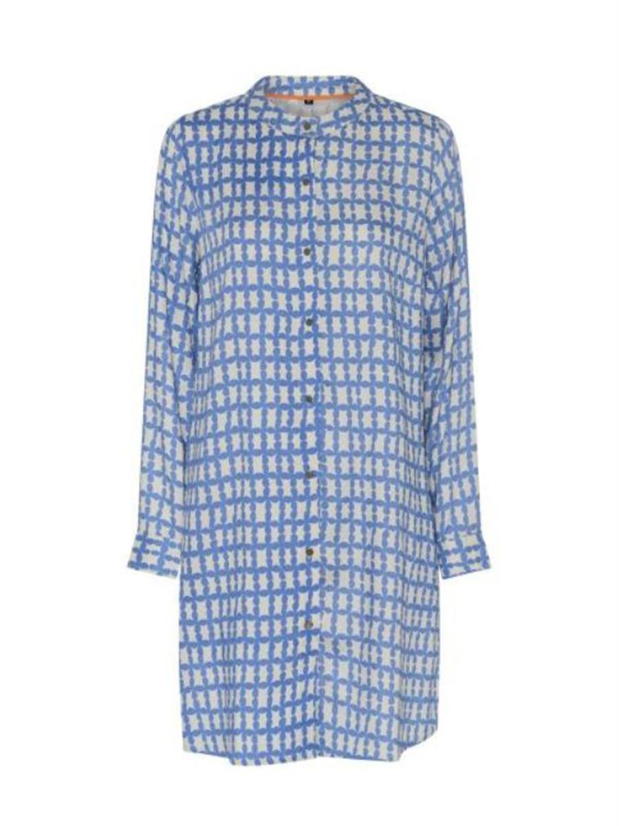Den fineste tunika/lange skjorte fra Soulmate i hvidt og provence blåt mønster i en blød og let viskose kvalitet. Der er knaplukning hele vejen ned og smukke mønstrede messing knapper. Rund halsskærring. Knap i ærmelukningen.