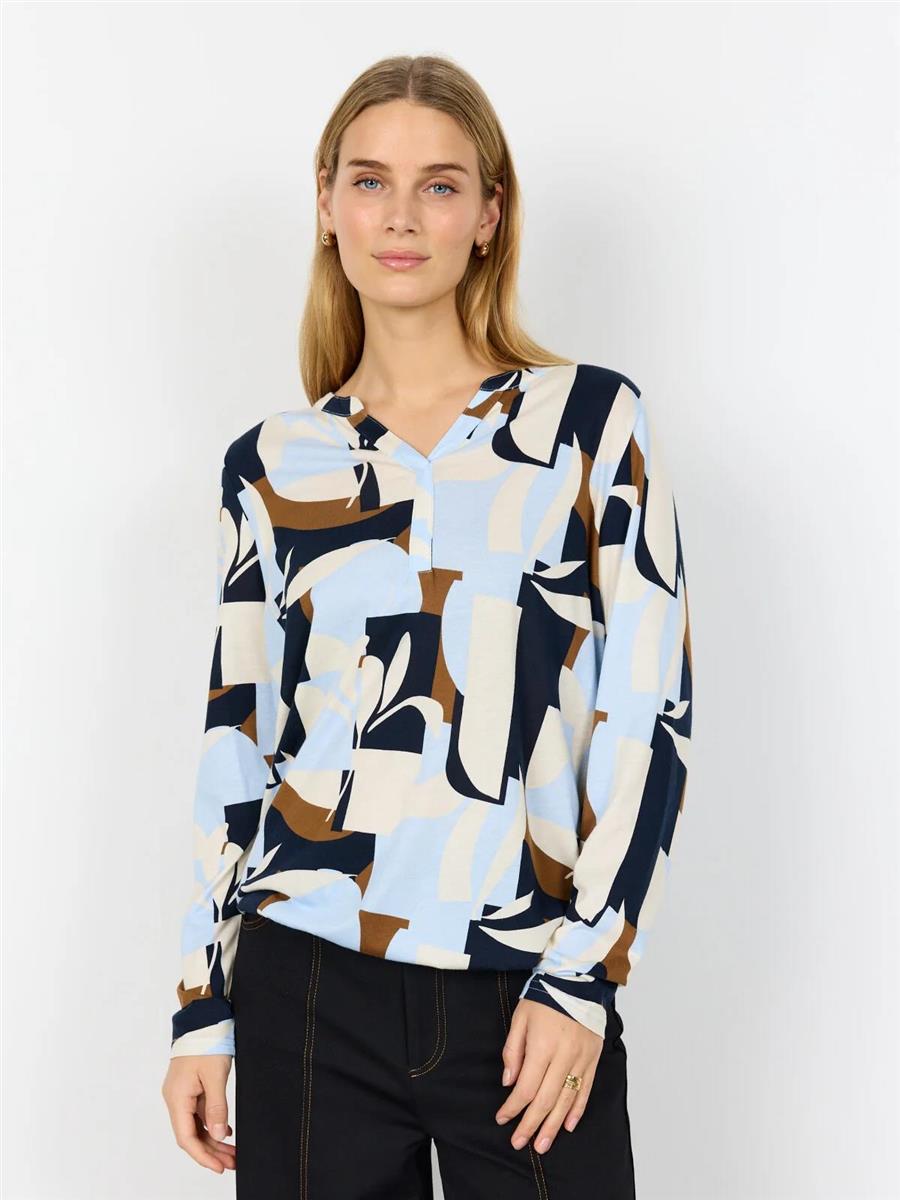 SC-FELICITY AOP 531 er en bluse fremstillet af 50 % økologisk bomuld og 50 % viskose. Den har v-halsudskæring og et unikt abstrakt print.