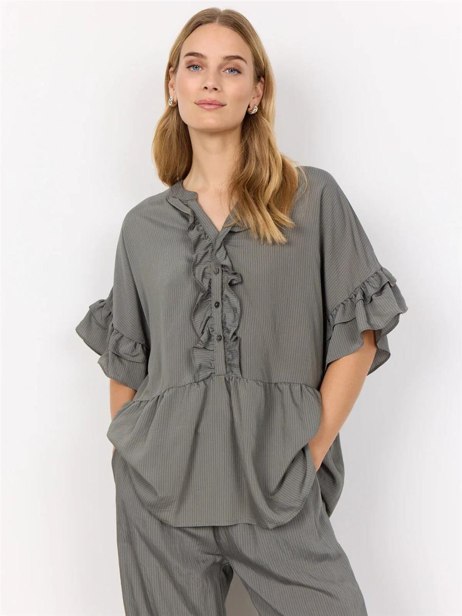 SC-POY 3 er en elegant bluse fremstillet af 87% ECOVERO-viskose og 13% nylon. Blusen har flæsekrave, knapper, korte ærmer med flæsedetaljer og en rynket talje, der giver en flatterende pasform.