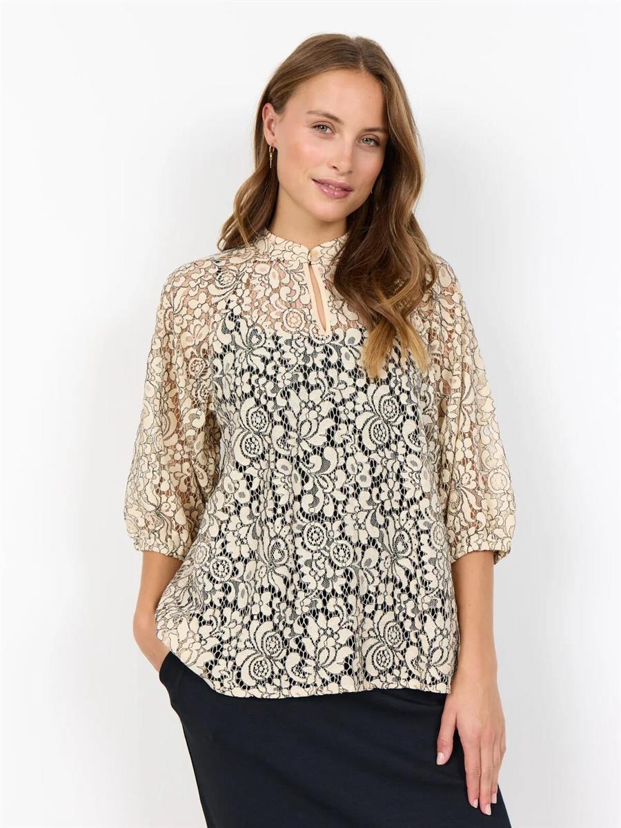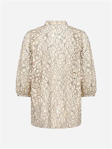 Blusen er cremefarvet med sorte sygninger der fremhæver blondemønsteret.