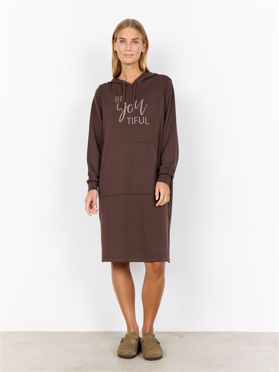 SC-BANU 259 Dress er fremstillet af 48 % modal, 48 % polyester og 4 % elastan. Den har hætte, lange ærmer, en lomme foran og et grafisk tryk foran. Sæt den sammen med sneakers for et afslappet look eller med leggings for ekstra varme.