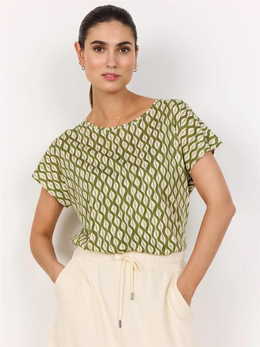 SC-FELICITY AOP 506 er en kortærmet T-shirt fremstillet i en behagelig blanding af 50 % økologisk bomuld og 50 % viskose. T-shirten har et unikt all-over printdesign, en rund halsudskæring og en afslappet pasform, der falder flot.