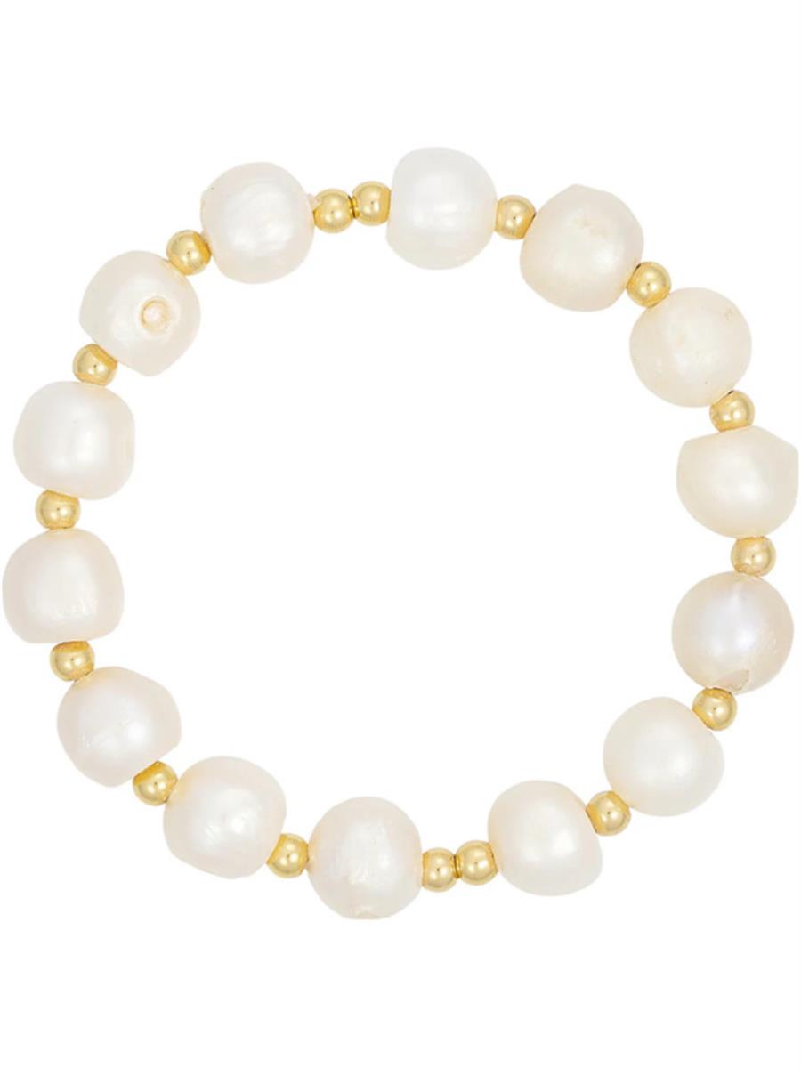 Smukt perlearmbånd fra Tim & Simonsen. Armbåndet er lavet af guldbelagt strelingsølv samt ferskvands perler som hver i sær faldt forskelligt ud. Armbåndet er med elastik, så der er nemt at tage af og på.