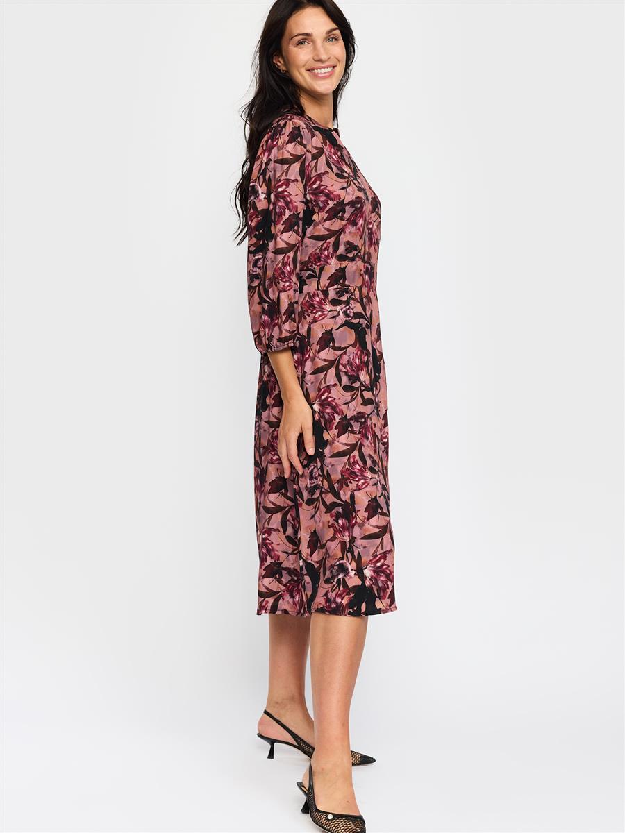 Flot mønstret kjole fra 2-BIZ med 3/4 ærme med elastik. Kjolen har en lille v-hals udskæring, elastik bånd bagpå ved ryg, der giver kjolen figur.