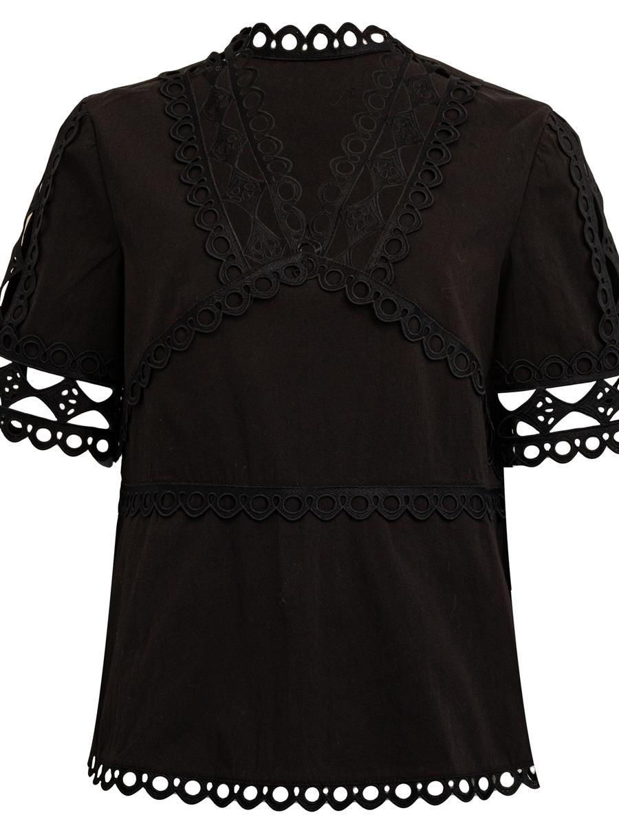 Virkelig smuk bluse fra Costamani. Blusen har korte ærmer og V-hals. Meget fine blonder, som også giver et kig til huden.