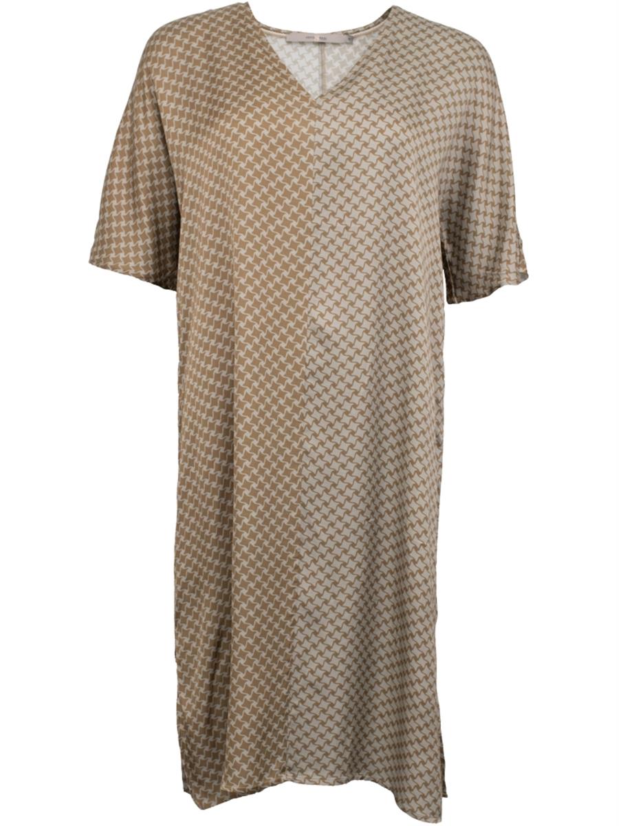 Smuk karamel mønstret kjole fra Costamani. V-hals udskæring med korte ærmer. Den går til knæene og med fin slids i begge sider. Modellen har gode store lommer i siden.Kvalitet: 100% Viskose