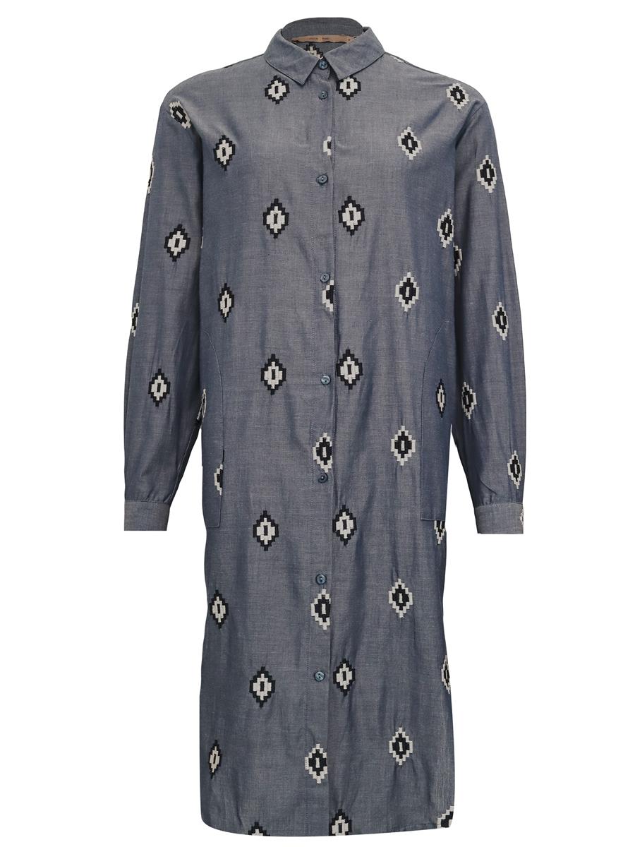 Meget fin kjole/skjorte med lange ærmer fra Costamani. Kjolen er gennemknappet og kan også bruges åbenstående som jakke eller skjorte. Den har et flot mønster, som er syet på.