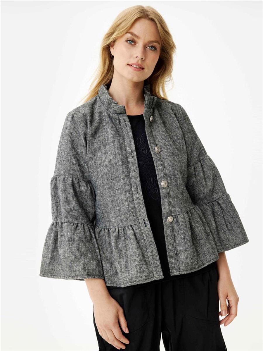 Smart jakke fra In Front med ¾ lange og brede ærmer, en lille flæsekant i halsen og en cropped længde.