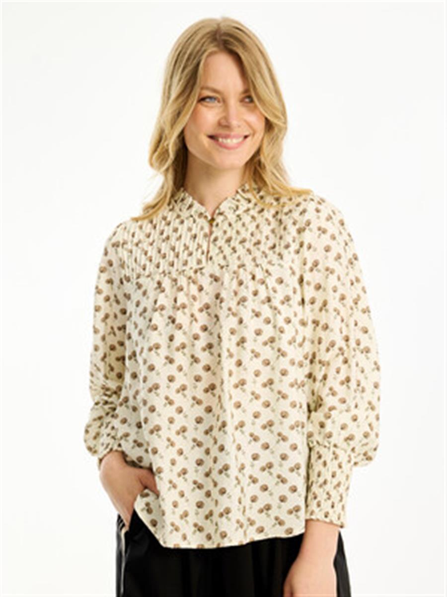 Cremefarvet langærmet skjorte med blomster, smock ved ærmer, flæsekrave og stolpelukning.