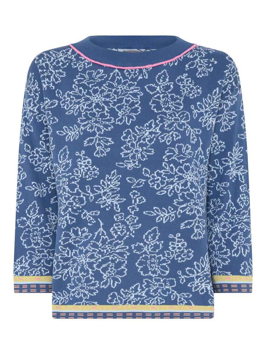 Strikken er med et fint blomstermotiv og rib i kontrastfarver.