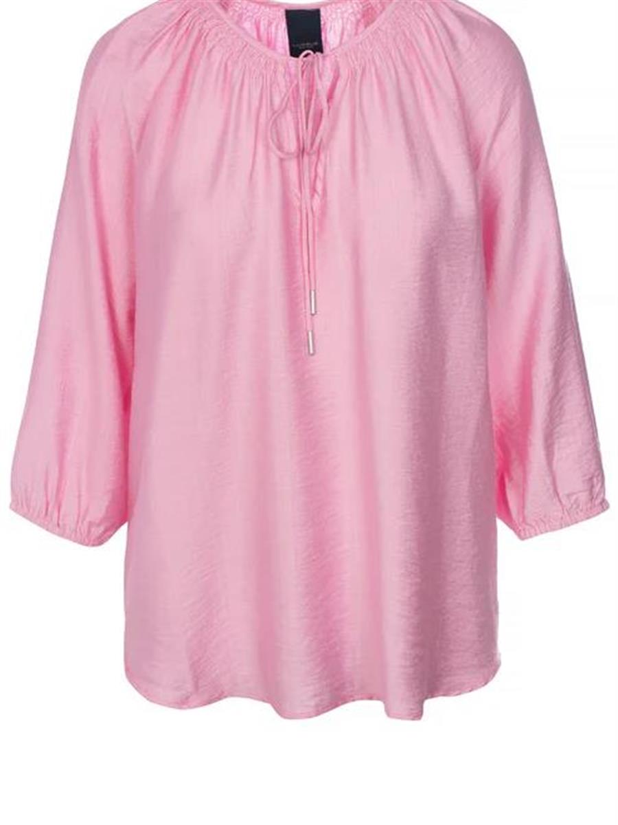 Denne bluse har en løs pasform med 3/4 lange ærmer, der afsluttes med en smal elastisk og en smuk snørelukning i halsen, der kan bruges åben og lukket. Det lette stof og den rummelige form med pænt afrundet bundkant, giver en komfortabel og stilfuld pasform.