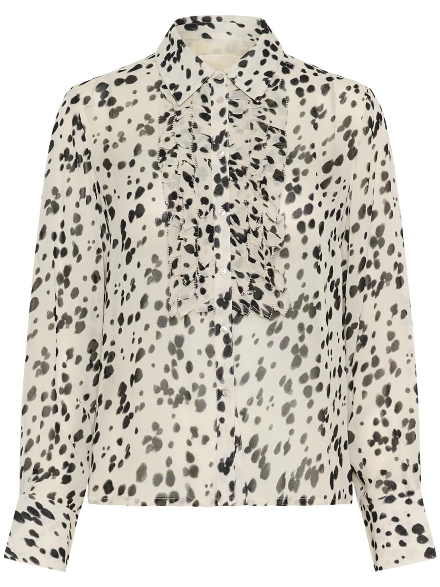 Skjorten er råhvid med plettet sort/grå "akvarel" mønster.