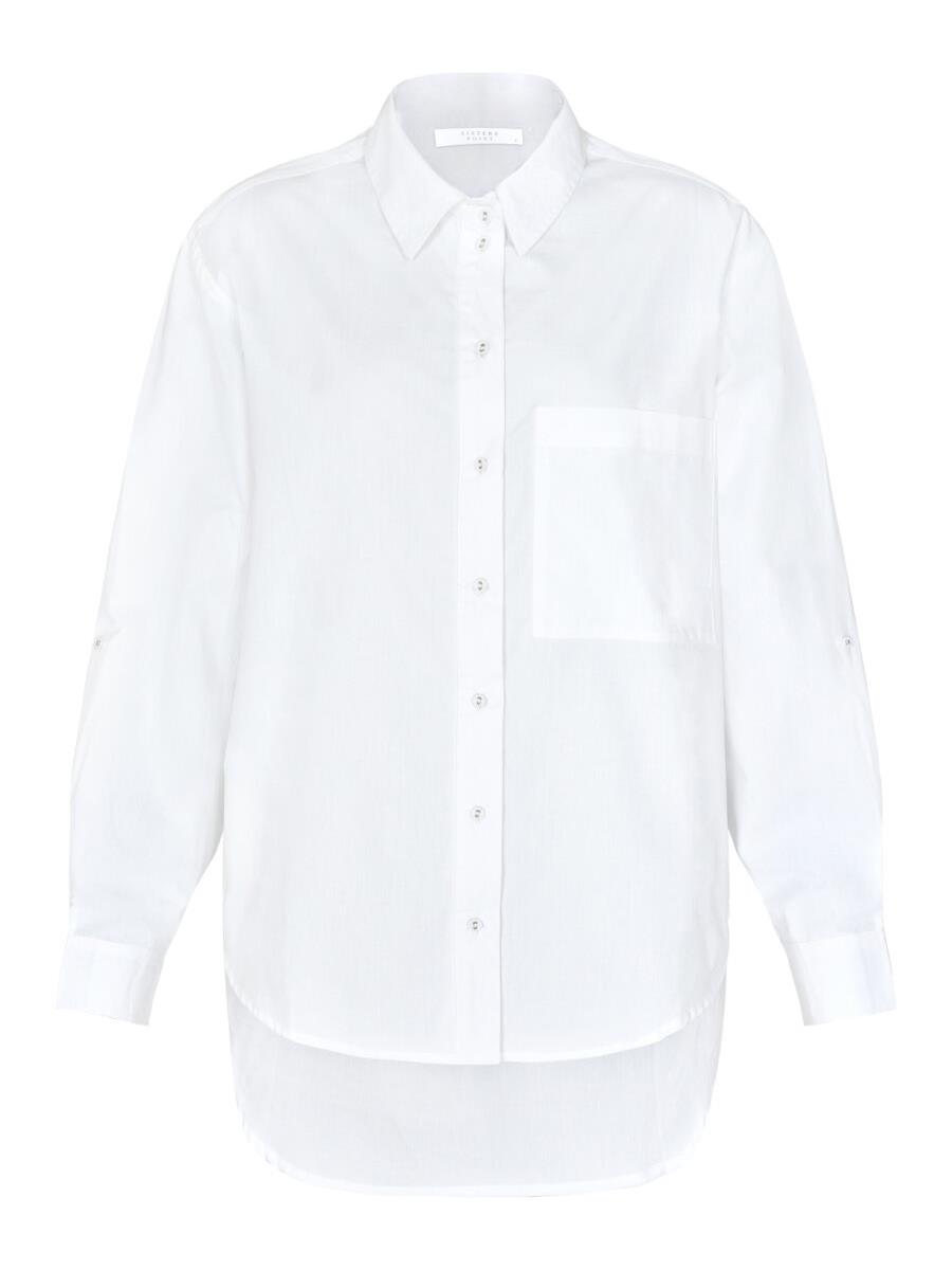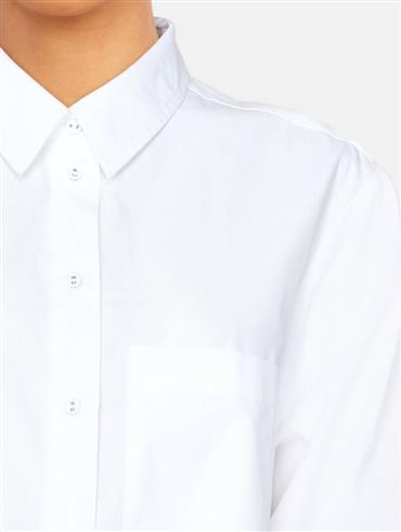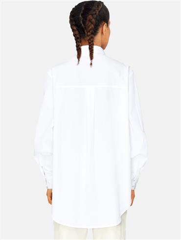Hvid, halvlang og let oversized skjorte, med fin detalje i form stofbeklædte knapper fortil og på manchetterne.