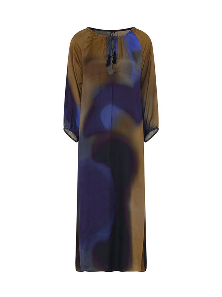 Kjolen har en v-udskæring med bindebånd og et smalt elastik for enden af ærmet. Stoffet har en smule glans, hvilket giver kjolen et smukt og eksklusivt look.