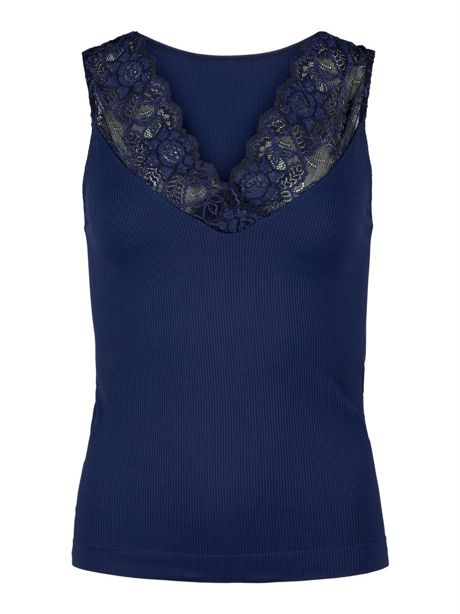Lækker microfiber rib-top fra Tim & Simonsen med fin blondekant og v-halsudskæring.